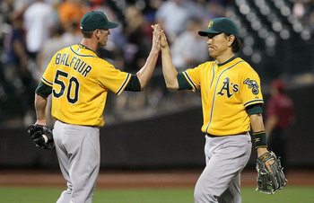 Hideki Matsui congratulates A's closer Grant Balfour after yet another save.