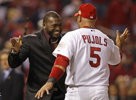 to vote for their favorite 2012 Roberto Clemente Award nominee: Willie Bloomquist (Arizona D-backs), Tim Hudson (Atlanta Braves), Jim Johnson (Baltimore Orioles), Jon Lester (Boston Red Sox), David DeJesus (Chicago Cubs), Jake Peavy (Chicago White Sox), Todd Frazier (Cincinnati Reds), Jason Kipnis (Cleveland Indians), Michael Cuddyer (Colorado Rockies), Miguel Cabrera (Detroit Tigers), Wesley Wright (Houston Astros), Alex Gordon (Kansas City Royals), C.J. Wilson (Los Angeles Angels), Clayton Kershaw (Los Angeles Dodgers), Logan Morrison (Miami Marlins), Rickie Weeks (Milwaukee Brewers), Justin Morneau (Minnesota Twins), Johan Santana (New York Mets), Mark Teixeira (New York Yankees), Brandon McCarthy (Oakland Athletics), Jimmy Rollins (Philadelphia Phillies), Chris Resop (Pittsburgh Pirates), Matt Holliday (St. Louis Cardinals), Luke Gregerson (San Diego Padres), Matt Cain (San Francisco Giants), Felix Hernandez (Seattle Mariners), David Price (Tampa Bay Rays), Michael Young (Texas Rangers), Ricky Romero (Toronto Blue Jays) and Ryan Zimmerman (Washington Nationals).2008 Roberto Clemente Award winner Albert Pujols congratulates David Ortiz after being named 2011 Roberto Clemente Award winner before game two of the 2011 World Series between the St. Louis Cardinals and Texas Rangers.Past Roberto Clemente Award winners have included David Ortiz, Tim Wakefield, Derek Jeter, Albert Pujols, Craig Biggio, Carlos Delgado, John Smoltz, Edgar Martinez, Jamie Moyer, Jim Thome, Curt Schilling, Al Leiter, Tony Gwynn, Sammy Sosa, Eric Davis, Kirby Puckett, Ozzie Smith, Dave Winfield, Barry Larkin, Cal Ripken, Jr., Harold Reynolds, Dave Stewart, Gary Carter, Dale Murphy, Rick Sutcliffe, Garry Maddox, Don Baylor, Ron Guidry, Cecil Cooper, Ken Singleton, Steve Garvey, Phil Niekro, Andre Thornton, Greg Luzinski, Rod Carew, Pete Rose, Lou Brock, Willie Stargell, Al Kaline, Brooks Robinson and Willie Mays.Willie Mays congratulates Roberto Clemente after hitting his 3000th and final career regular season hit in a game against the Mets in Pittsburgh on September 30, 1972.