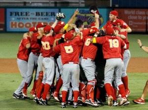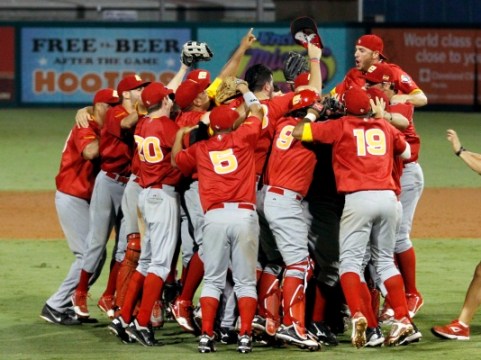 Spain players celebrate their 9-7 win after 10 innings against Israel at a World Baseball Classic qualifier baseball game in Jupiter, Fla., Sunday, Sept. 23, 2012. (AP Photo/Alan Diaz)