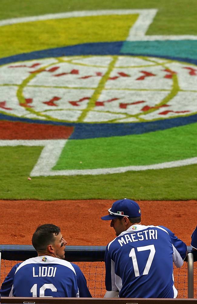 I was really happy to go there. It was really fun.Italian National team coach Mike Piazza (shown here as coach of Team USA) and Seattle Mariners’ Alex Liddi (shown here playing for Team World) in the 2011 All-Star Futures GameAlex Liddi and Alessandro Maestri talk strategy in the Italia dugout.Roberto: You have a special bond with Alessandro Maestri, the first Italian-born-and-raised pitcher to be signed by MLB. He also waves the Italian baseball flag internationally just as you do. Let’s talk about your friendship and what makes him a competitor.