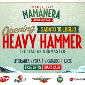 The 2015 Mamanera Reggae Boom Beach summer lineup is as follows: July 25–I-Shence (Perugia); August 1–Villada Posse (Rome); August 8–Black Chiney (Miami); August 10–Mr. Vegas (Jamaica); August 12–Johnny Osbourne (Jamaica)/Soul Stereo (France); August 13–Heavy Hammer Sound 16th Anniversary Party with Killamanjaro Sound (Jamaica); August 15–Sound Clash between Sentinel Sound (Germany) and Coppershot Sound (Jamaica); August 17–Mananera Revolution; August 20–Original Salento Dancehall: No-Tap! with Mamanera All-Stars. www.Mamanera.com