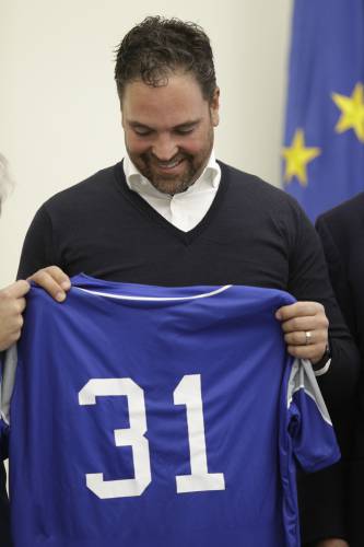Hall of Fame catcher Mike Piazza is presented his jersey during a press conference announcing him as Italy’s national baseball team manager at the Italian Olympic Committee headquarters in Rome on November 29, 2019. (AP Photo/Alberto Pellaschiar)