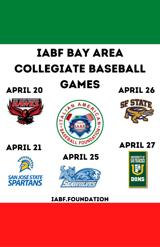 The IABF will honor the IABF All-Stars, their coaching staff and prominent Bay Area Italian American college baseball coaches Brad San Filippo (San Jose State University), Tony Ragusa (Sonoma State University), Tony Schifano (San Francisco State University) and Craig Gianinno (University of San Francisco) at the San Francisco Italian Athletic Club on Sunday, April 24, 2022 beginning at 6 pm with complimentary Italian appetizers followed by an exclusive Meet-and-Greet with the visiting Italian players, former Team Italy and MLB players and current Italian American Bay Area coaches. For tickets to this special event, click HERE.